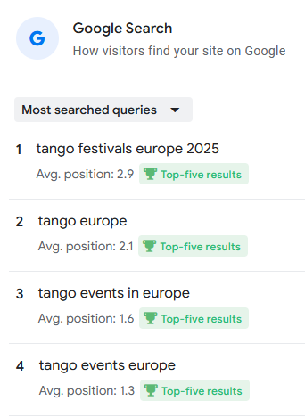 Tango Events and Memories is high on the Google Results with more than 20 keywords being at the top 5 positions.